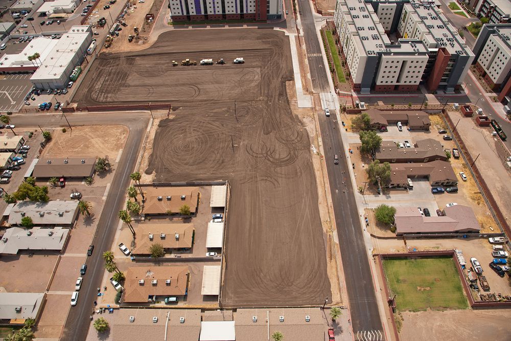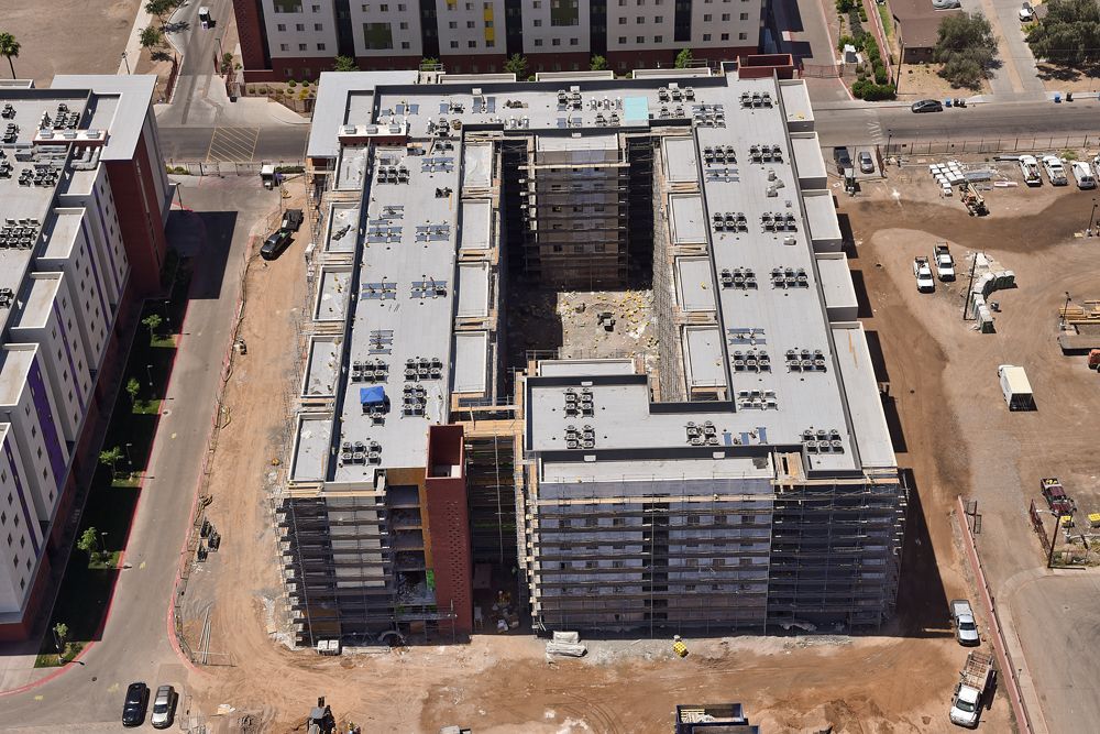 Oak Creek, 156-unit student housing project for Grand Canyon University, was completed in 9 months. The first two podium floors feature concrete columns and post-tension decks, while the top four floors are wood-framed. Decorative colored block stair towers and a first-floor design enhance aesthetics. Tall curtain walls bring natural daylight into the corridors.
