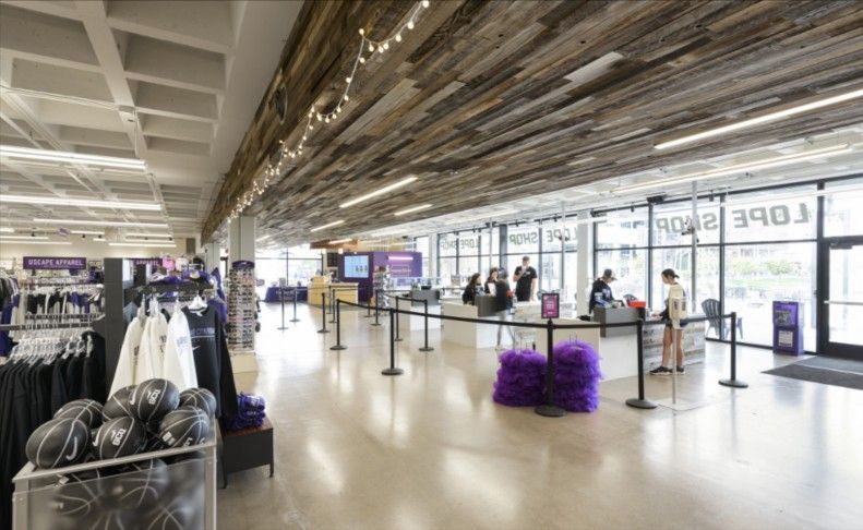 Lopes Store TI is a remodel of a 39,870-sf precast classroom building for Grand Canyon University, took 4 months. The project stripped the structure to its framework and fully rebuilt it, adding a storefront and canopy at the main entrance, along with decorative wood accents along the main aisle.
