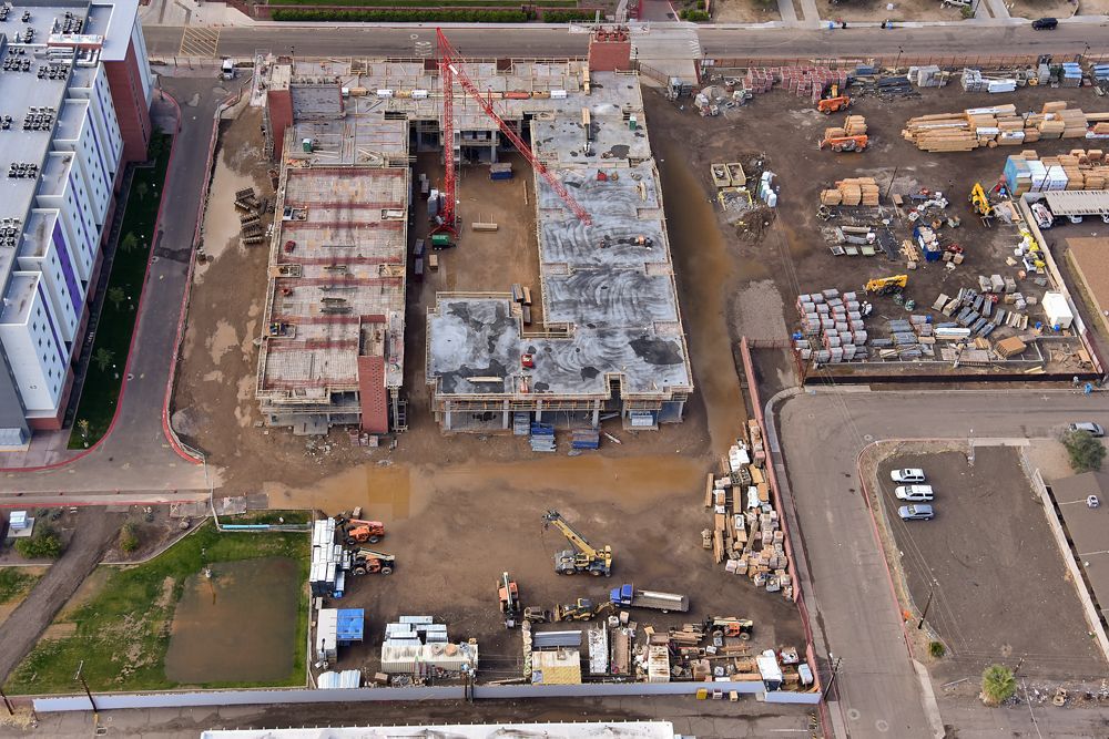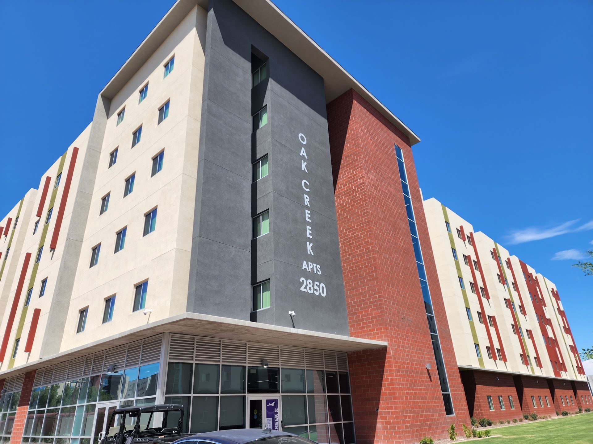Oak Creek, 156-unit student housing project for Grand Canyon University, was completed in 9 months. The first two podium floors feature concrete columns and post-tension decks, while the top four floors are wood-framed. Decorative colored block stair towers and a first-floor design enhance aesthetics. Tall curtain walls bring natural daylight into the corridors.
